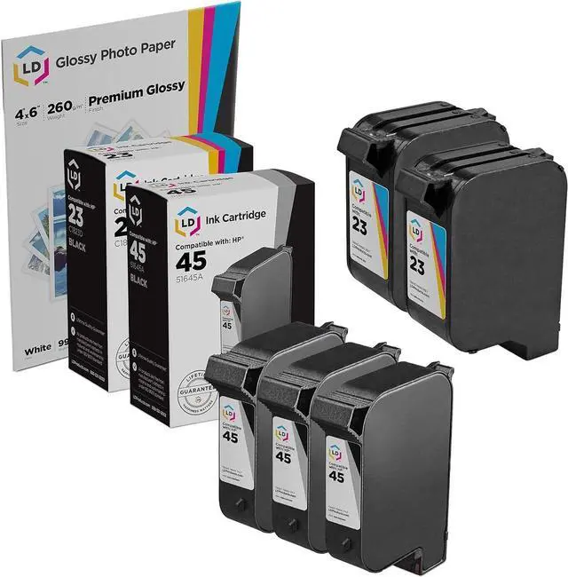 Save and print even more with our remanufactured replacements for hp 23 tricolor ink cartridges. This offer includes 1 remanufactured replacement for C1823D color / HP 23 ink cartridge, (1) 51645A / HP 45 black ink cartridge, and 1 pack of 4-inch x 6-inch glossy photo inkjet paper! Why pay twice as much for expensive brand name ink? Compatible with Color Copier 140, Color Copier 145, Color Copier 150, Color Copier 155, Color Copier 160, Color Copier 170, Color Copier 260, Color Copier 270, DeskJet 1120C, DeskJet 1220cse, DeskJet 1220cxi, DeskJet 710, DeskJet 710C, DeskJet 712, DeskJet 712C, DeskJet 720, DeskJet 720C, DeskJet 722, DeskJet 722C, DeskJet 782, DeskJet 782C, DeskJet 815, DeskJet 815C, DeskJet 830, DeskJet 830C, DeskJet 832, DeskJet 832C, DeskJet 880, DeskJet 880C DeskJet 882, DeskJet 890, DeskJet 890C, DeskJet 890Cse, DeskJet 890cxi, DeskJet 895, DeskJet 895cse, DeskJet 895Cxi, OfficeJet 1170, OfficeJet 1170C, OfficeJet R40, OfficeJet R60, OfficeJet R80, OfficeJet T45, OfficeJet T45i, OfficeJet T46, OfficeJet T65, OfficeJet T65xi, OfficeJet Pro 1170, OfficeJet Pro 1170C, OfficeJet Pro 1170Cse, OfficeJet Pro 1170Cxi, OfficeJet Pro 1175, OfficeJet Pro 1175C, OfficeJet Pro 1175Cse, and OfficeJet Pro 1175Cxi inkjet printers. Please note, retail packaging may vary, and these cartridges will only work with printers purchased within the United States and Canada. The use of replacement ink cartridges for HP printers and supplies does not void your printers warranty. Professionally remanufactured by LD Products. HP is a registered trademark of HP Inc. and is not affiliated with and does not endorse LD Products. Visit our main site LD Products to know more details and we are glady to assist you there. Educate yourself on how to be a smarter printer shopper and check out our list of recommended printers with the most ink-efficient cartridges. Thank you!