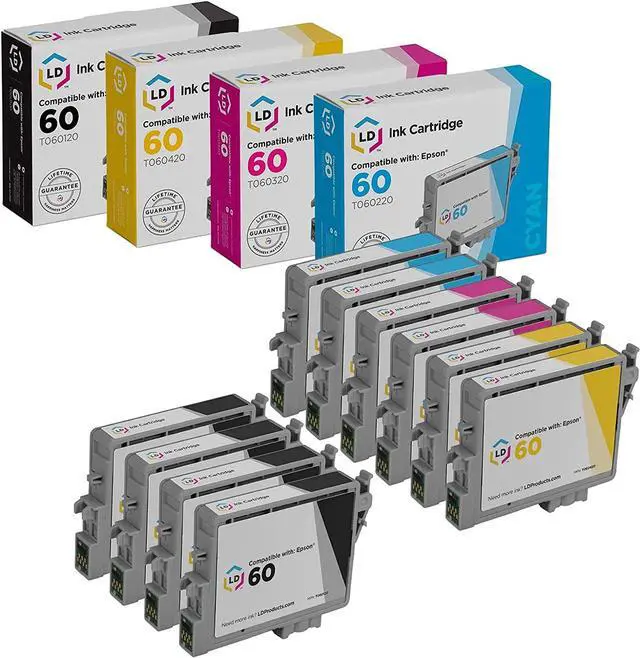 Save and print even more when you shop with LD Products! This offer includes the following ink cartridge replacements (4) Epson T060120 black, (2) Epson T060220 cyan, (2) Epson T060320 magenta and (2) T Epson 060420 yellow ink cartridges. Why pay more for brand name ink when our remanufactured printer supplies are guaranteed to meet or exceed the same quality standards as the original brand? These cartridges are compatible with the following Epson Stylus printers: C68, C88, C88 Plus, CX3800, CX3810, CX4200, CX4800, CX5800f and CX7800. Please note, retail packaging may vary, and this set will only work with printers purchased within the United States and Canada. The use of remanufactured printing supplies does not void your printers warranty. Epson is a registered trademark of SEIKO EPSON KABUSHIKI KAISHA Corporation and is not affiliated with and does not endorse LD Products. Professionally remanufactured by LD Products.