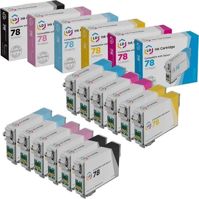 Save even more with our 12 ink cartridge set for the Epson T078 series. This bulk set includes 2 black T078120 (T0781) ink cartridges, 2 cyan T078220 (T0782), 2 magenta T078320 (T0783), 2 yellow T078420 (T0784), 2 light cyan T078520 (T0785) and 2 light magenta T078620 (T0786) inkjet cartridges. The bundle discount brings the cartridge price down to a very low $4.99 each! Why pay twice as much for brand name Epson T078 printer ink cartridges when our generic brand printer supplies deliver excellent quality results for a fraction of the price? So Stock up now and save even more! LD ?? Cartridges are manufactured in an internationally certified ISO 9002 factory. LD ?? cartridges come with a 100% Two Year money back guarantee and technical support. For use in the following printers: Stylus Photo R380, RX680, R280, RX595, RX580, R260 Artisan 50.