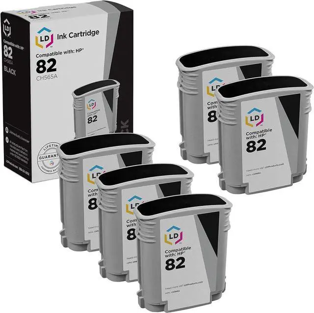 Save even more with our remanufactured inkjet cartridges. This listing contains 5 CH565A black inkjet cartridge. Why pay twice as much for brand name Hewlett Packard 82 cartridge when our remanufactured printer supplies deliver excellent quality results for a fraction of the price? Our remanufactured brand replacement ink cartridges for HP are backed by a full 1 year 100% satisfaction guarantee. So stock up now and save even more! Our remanufactured ink cartridges are not remanufactured by HP. This set works in the following HP DesignJet printers: 111, and 510. Please note, retail packaging may vary and this item will only work with printers purchased within the United States and Canada. We are the exclusive reseller of LD Products brand of high quality printing supplies.
