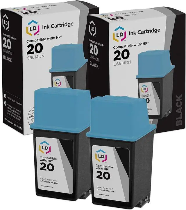 Save and print even more when you shop with LD Products! This offer includes 2 remanufactured replacements for C6614DN / HP 20 black pigment ink cartridges. Why pay twice as much for expensive brand name ink when our remanufactured replacement printer supplies are backed by a 100% satisfaction and lifetime guarantee? For use in Apollo: P2100U P2200 P2300U P2500 P2600 | DeskJet: 610 610C 610CL 612 612C 630 630C 632 632C 640 640C 642 642C 648 648C 656 656C 656CVR | Fax: 1010 1010xi 1020 1020xi 1040 1040xi and 1050 printers. Please note, retail packaging may vary, and these cartridges will only work with printers purchased within the United States and Canada. The use of replacement cartridges and supplies does not void your printers warranty. Professionally remanufactured by LD Products. HP is a registered trademark of HP Inc. and is not affiliated with and does not endorse LD Products.
