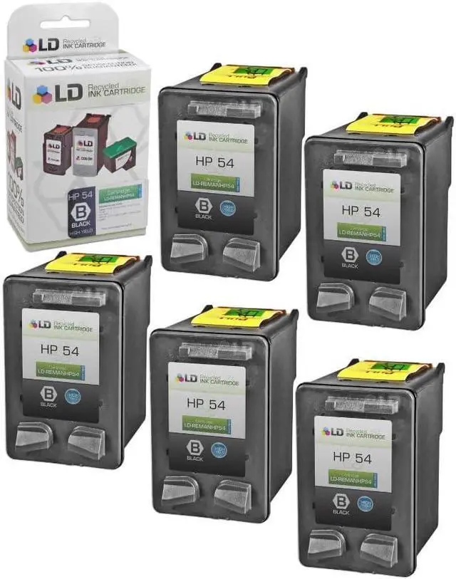 Save even more with our 5 pack of professionally remanufactured replacements for HP 54 (CB334AN) High Yield Black Inkjet cartridges. These LD remanufactured CB334AN (HP 54) high-yield black inkjet cartridges are original Hewlett Packard CB334AN ink cartridges which have been through one cycle of service and have been recharged. These LD remanufactured CB334AN ink cartridges have been thoroughly cleaned along with the printhead nozzles. Following the cleaning process, we refilled the cartridge with a professionally manufactured ink formula that is designed to produce vibrant and long-lasting prints comparable to HP. After carefully inspecting the shell for leakage and monitoring the electrical circuitry for efficiency, we put the cartridge through a final print test to be certain it is worthy of our 100% money-back guarantee. Our remanufactured ink cartridges are not remanufactured by HP. This combo set works with the following HP Printers: DeskJet F4135, F4140, F4150, F4172, F4180, F4185, FAX 3180, OfficeJet J3608, 3625, J3635, J3640, J3650, and J3680. We are the exclusive reseller of LD Products brand of high quality printing supplies.