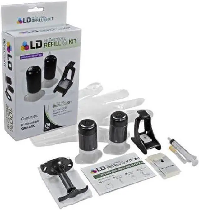 Save and print even more when you shop with LD Products! This HP 60 / 60XL Black Ink Refill Kit contains: (2) 20ml black ink bottles, (1) manual, (1) screw tool, (2) injection needles and (1) pair of plastic gloves. LD inkjet cartridge refill kits allow you to refill your existing empty ink cartridge. Why buy an expensive brand-new ink cartridge when you can refill the cartridge you already have for much less? The HP 60 / 60XL black ink cartridge is compatible with the following printers: DeskJet D1620, D1630, D1658, D1660, D1663, D1668, D2530, D2545, D2560, D2563, D2566, D2568, D2645, D2660, D2663, D2666, D2668, D2680, D5545, D5560, D5563, D5568, F2400, F2420, F2423, F2430, F2480, F2483, F2488, F2492, F2493, F4210, F4213, F4230, F4235, F4240, F4250, F4272, F4273, F4274, F4275, F4280, F4283, F4288, F4292, F4293, F4400, F4450, F4480, F4500, F4580, ENVY 100, 110, 111, 114,120, 121 & PhotoSmart C4600, C4610, C4635, C4640, C4650, C4680, C4683, C4685, C4690, C4700, C4740, C4750, C4780, C4783, C4795, C4799, D110a