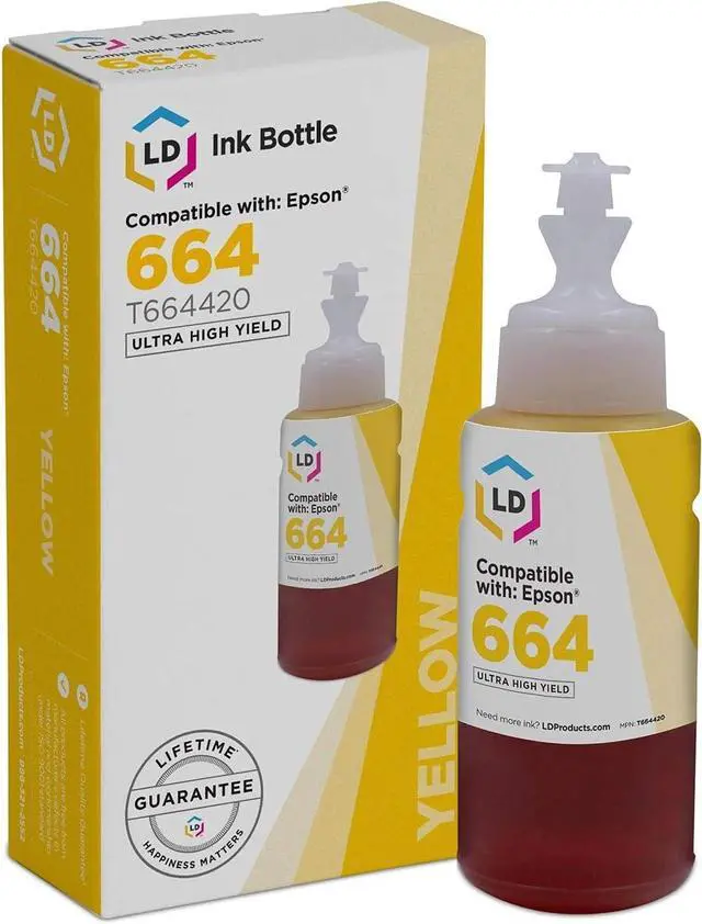 Save even more with our remanufactured ink bottle. This listing contains 1 T664420 yellow ink bottle. Why pay twice as much for brand name Epson 664 bottle when our remanufactured printer supplies deliver excellent quality for a fraction of the price? Our remanufactured bottles for Epson are backed by a 100% satisfaction & LIFETIME guarantee. So stock up now and save even more! This item works in the following Epson Expression and Workforce Printers: Expression ET 2500, 2550, 4500 and Workforce ET 16500. Please note, retail packaging may vary and this item will only work with printers purchased within the United States and Canada. We are the exclusive reseller of LD Products brand of high quality printing supplies.