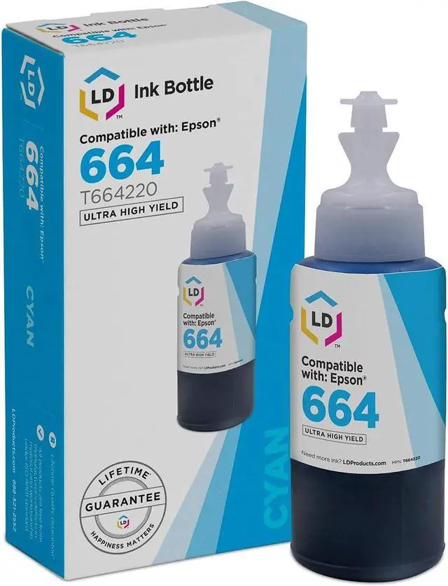 Save even more with our remanufactured ink bottle. This listing contains 1 T664220 cyan ink bottle. Why pay twice as much for brand name Epson 664 bottle when our remanufactured printer supplies deliver excellent quality for a fraction of the price? Our remanufactured bottles for Epson are backed by a 100% satisfaction and LIFETIME guarantee. So stock up now and save even more! This item is compatible with Epson Expression ET-2500, ET-2550, ET-4500 and Workforce ET-16500, ET-4500, ET-4550. Please note, retail packaging may vary and this item will only work with printers purchased within the United States and Canada. We are the exclusive reseller of LD Products brand of high quality printing supplies.