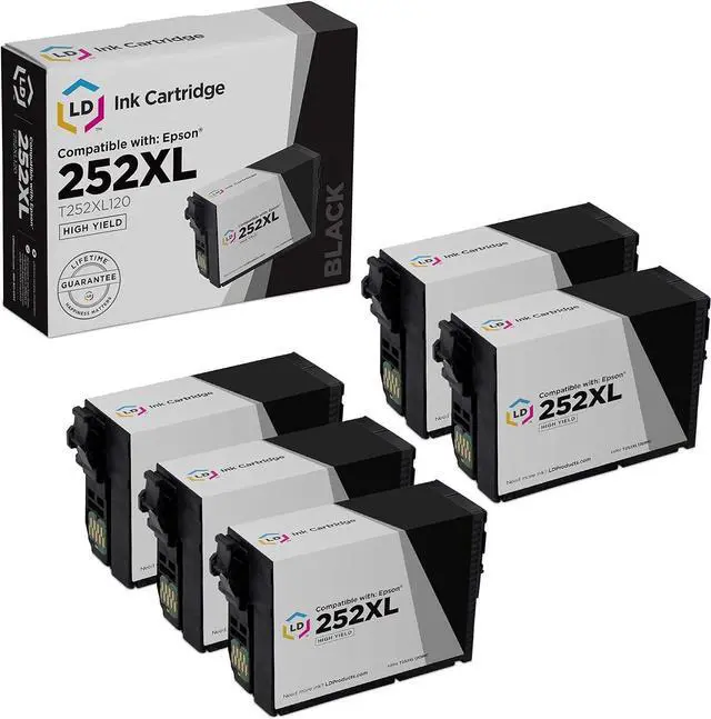 Save and print even more with our replacements for Epson 252XL cartridges. This offer includes (5) T252XL120 / T252120 high yield black ink cartridges. Why pay twice as much for expensive brand name Epson Workforce cartridges when our compatible replacements are backed by a 100% satisfaction and lifetime guarantee? Compatible with Epson WorkForce WF-3620, WF-2640, WF-7110, WF-7610 and WF-7620 printers. Please note, retail packaging may vary, and these cartridges will only work with printers purchased within the United States and Canada. The use of replacement Epson cartridges and supplies does not void your printers warranty. Epson is a registered trademark of SEIKO EPSON KABUSHIKI KAISHA Corporation and is not affiliated with and does not endorse LD Products. Professionally remanufactured by LD Products.