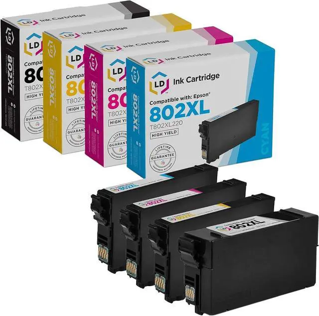 Save and print even more when you shop with LD Products! This offer includes 1 T802120 Standard Yield Black, 1 T802XL220 High Yield Cyan, 1 T802XL320 High Yield Magenta and 1 T802XL420 High Yield Yellow ink cartridges. This ink cartridge set is compatible with Epson WF Series: WF-4720, WF-4730, WF-4734, WF-4740, WF-4740DWF. Epson WorkForce: WF-4720, WF-4730, WF-4734, WF-4740. Epson WorkForce Pro: WF-4720, WF-4730, WF-4734, WF-4740, WF-4740DWF. Please note, retail packaging may vary and these cartridges will only work with printers purchased within the United States and Canada. The use of remanufactured replacement cartridges and supplies does not void your printer warranty. Epson is a registered trademark of SEIKO EPSON KABUSHIKI KAISHA Corporation and is not affiliated with and does not endorse LD Products. Professionally remanufactured by LD Products