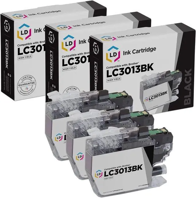 Save and print even more when you shop with LD Products! This offer includes (3) LC3013BK High Yield Black ink cartridges; they replace the Brother LC3011BK Standard Yield ink. Why pay twice as much for expensive brand name Brother ink when our compatible printer supplies are backed by a 100% Satisfaction and LIFETIME Guarantee? This ink cartridge set is guaranteed to work in Brother MFC-J491DW, MFC-J497DW, MFC-J690DW and MFC-J895DW printers. Please note, retail packaging may vary and these ink cartridges will only work with printers purchased within the United States and Canada. The use of compatible replacement cartridges and supplies does not void your printer warranty. Brother does not manufacture our compatible toner cartridges. Brother is a registered trademark of Brother Industries, Ltd. and is not affiliated with and does not endorse LD Products. We are the exclusive reseller of LD Products brand of high quality printing supplies.