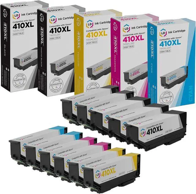 Save and print even more when you shop with LD Products! This offer includes (3) T410XL020 high yield black, (2) T410XL220 high yield cyan, (2) T410XL320 high yield magenta, (2) T410XL420 high yield yellow and (2) T410XL120 high yield photo black ink cartridges; they replace the original Epson 410 / T410 standard yield ink series. Why pay twice as much for brand name Epson ink when our remanufactured printer supplies are guaranteed to meet or exceed the same quality standards as the original (OEM) brand? This cartridge set is compatible with Epson Expression XP-530, XP-630, XP-635, XP-640 and XP-830 printers. Please note, retail packaging may vary and these cartridges will only work with printers purchased within the United States and Canada. The use of remanufactured printing supplies does not void your printer warranty. We are proud to offer a 100% satisfaction and LIFETIME guarantee on all compatible and remanufactured printing products. We are the exclusive reseller of LD Products brand of high quality printing supplies.