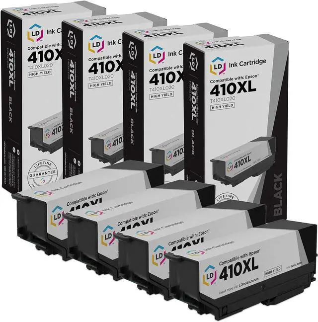 Save and print even more when you shop with LD Products! This offer includes (4) T410XL020 / 410XL high yield black ink cartridges. Why pay twice as much for brand name Epson ink when our remanufactured printer supplies meet or exceed the same quality standards as the original (OEM) brand? These cartridges are compatible with Epson Expression XP-530, XP-630, XP-635, XP-640 and XP-830. Please note, retail packaging may vary and these cartridges will only work with printers purchased within the United States and Canada. The use of remanufactured replacement cartridges and supplies does not void your printers warranty. We are the exclusive reseller of LD Products brand of high quality printing supplies.