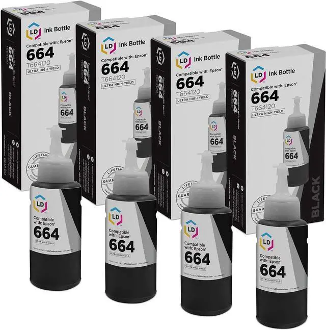 Save even more with our set of 4 remanufactured ink bottles. This listing contains 4 T664120 black ink bottles. Why pay twice as much for brand name Epson 664 bottle when our remanufactured printer supplies deliver excellent quality for a fraction of the price? Our remanufactured bottles for Epson are backed by a 100% satisfaction and LIFETIME guarantee. So stock up now and save even more! This set is compatible with Expression ET-2500, ET-2550, ET-4500 and Workforce ET-16500, ET-4500, ET-4550. Please note, retail packaging may vary and this item will only work with printers purchased within the United States and Canada. We are the exclusive reseller of LD Products brand of high quality printing supplies.