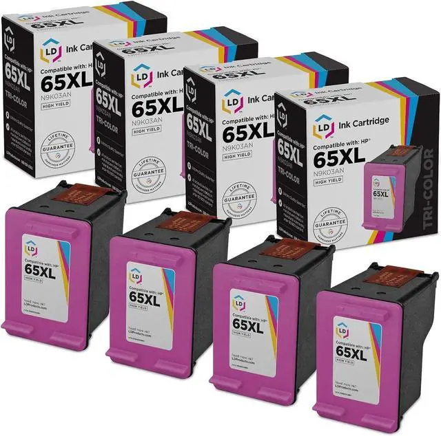Save and print even more when you shop with LD Products! This listing contains HP Ink 65 | HP 65 color High Yields (4) N9K03AN (65XL) Color ink cartridges. Why pay twice as much for brand name Hewlett Packard cartridges when our remanufactured printer supplies are backed by a two-year warranty and guaranteed to meet or exceed the same quality standards as the original (OEM) brand? These cartridges are original HP 65XLs that have been professionally remanufactured after one cycle of service; they have been disassembled, fully examined, thoroughly cleaned, and all worn components have been replaced. Compatible with HP DeskJet 3720, 3730, 3732, 3752, 3755 and 3758, HP envy 5055 ink cartridges, HP deskjet 3755 ink cartridges, HP deskjet 3700 ink, HP envy 5000 series ink cartridge, HP deskjet 2600, HP deskjet 2652. Please note, retail packaging may vary and these cartridges will only work with printers purchased within the United States and Canada. The use of remanufactured cartridges does not void your printers warranty. Speedy Inks remanufactured ink cartridges are not manufactured by HP. We are the exclusive reseller of Speedy Inks brand of high quality printing supplies.