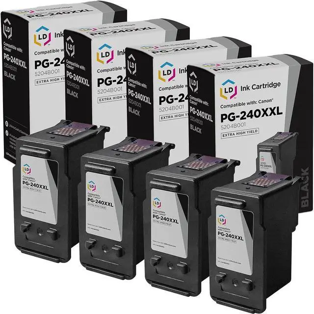 Save even more with our remanufactured inkjet cartridges. This listing contains 4 5204B001 Extra High Yield black cartridges. Why pay twice as much for brand name Canon PG-240XXL Cartridge when our remanufactured printer supplies deliver excellent quality for a fraction of the price? Our remanufactured cartridges for Canon are backed by a full 2 years 100% satisfaction guarantee. So stock up now and save even more! This set works in the following HP PIXMA Printers: MG2120, MG2220, MG3120, MG3122, MG3220, MG3222, MG3520, MG3522, MG3620, MG4120, MG4220, MX372, MX392, MX432, MX439, MX452, MX459, MX472, MX479, MX512, MX522, MX532. Please note, retail packaging may vary and this item will only work with printers purchased within the United States and Canada. We are the exclusive reseller of LD Products brand of high quality printing supplies.