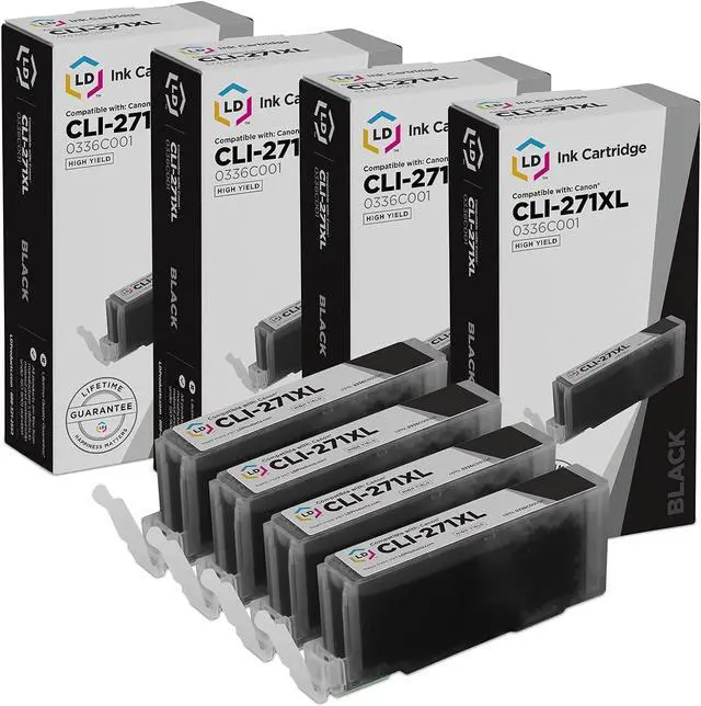 Save even more with our compatible high yield ink cartridges. This listing contains 4 0336C001 high yield black inkjet cartridges. Why pay twice as much for brand name Canon CLI-271XL Cartridge when our compatible printer supplies deliver excellent quality for a fraction of the price? Our compatible cartridges for Canon are backed by a full 2 years 100% satisfaction guarantee. So stock up now and save even more! This set works in the following Canon PIXMA Printers: MG5720, MG5721, MG5722, MG6820, MG6821, MG6822, MG7720. Please note, retail packaging may vary and this item will only work with printers purchased within the United States and Canada. We are the exclusive reseller of LD Products brand of high quality printing supplies.