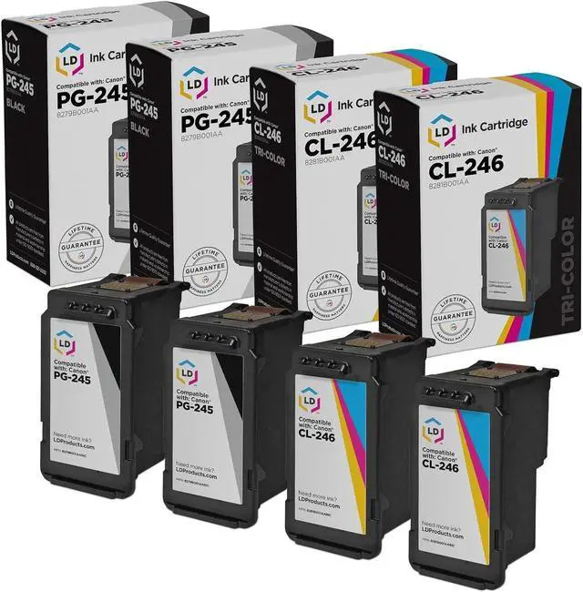 843964074386 Save even more with our set of 4 remanufactured inkjet cartridges. This set includes 2 8279B001AA Black, and 2 8281B001AA Color inkjet cartridges. Why pay twice as much for brand name Canon PG-245 / CL-246 cartridge when our remanufactured printer supplies deliver excellent quality results for a fraction of the price? Our remanufactured cartridges for Canon are backed by our 100% Satisfaction and Lifetime Guarantee. Compatible with Canon PIXMA: iP2820, MG2420, MG2520, MG2522, MG2525, MG2555, MG2920, MG2922, MG2924, MG3020, MG3022, MX490, MX492, TR4520, TR4522, TR4550, TS202, TS302, TS3120, TS3122, TS3129, TS3320, TS3322. Please note, retail packaging may vary and this item will only work with printers purchased within the United States and Canada. We are the exclusive reseller of LD Products brand of high quality printing supplies.