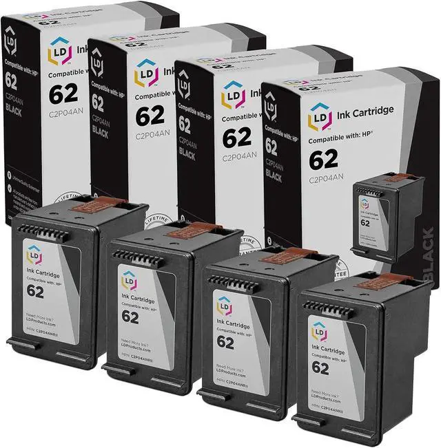 Save even more with our set of 4 remanufactured inkjet cartridges. This listing contains 4 C2P04AN black inkjet cartridges. Why pay twice as much for brand name Hewlett Packard 62 cartridge when our remanufactured printer supplies deliver excellent quality results for a fraction of the price? Our remanufactured cartridges for HP are backed by a full 2 year 100% satisfaction guarantee. So stock up now and save even more! Our remanufactured ink cartridges are not remanufactured by HP. This set works in the following HP ENVY and OfficeJet Printers: 5549, 5640, 5642, 5643, 5644, 5646, 5660, 7640, 7645, 5740, 5742, 5745, 200 Mobile, 250 Mobile. Please note, retail packaging may vary and this item will only work with printers purchased within the United States and Canada. We are the exclusive reseller of LD Products brand of high quality printing supplies.
