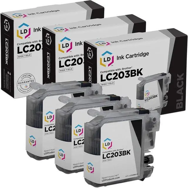 Save even more with our set of 3 compatible high yield ink cartridges. This set includes 3 LC203BK high yield black cartridges. Why pay twice as much for brand name Brother LC203 cartridge when our compatible printer supplies deliver excellent quality results for a fraction of the price? Our compatible cartridges for Brother are backed by a full 2 year 100% satisfaction guarantee. So stock up now and save even more! This set works in the following Brother MFC printers: J4320DW, J4420DW, J4620DW, J5520DW, J5620DW, and J5720DW. Please note, this item will only work with printers purchased within the United States and Canada. We are the exclusive reseller of LD Products brand of high quality printing supplies.