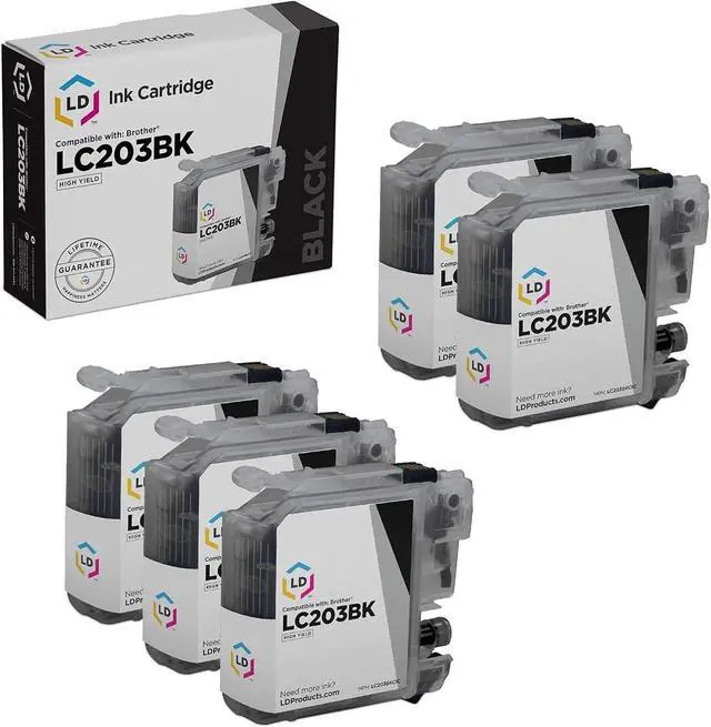 Save even more with our set of 5 compatible high yield ink cartridges. This set includes 5 LC203BK high yield black cartridges. Why pay twice as much for brand name Brother LC203 cartridge when our compatible printer supplies deliver excellent quality results for a fraction of the price? Our compatible cartridges for Brother are backed by a full 2 year 100% satisfaction guarantee. So stock up now and save even more! This set works in the following Brother MFC printers: J4320DW, J4420DW, J4620DW, J5520DW, J5620DW, and J5720DW. Please note, this item will only work with printers purchased within the United States and Canada. We are the exclusive reseller of LD Products brand of high quality printing supplies.