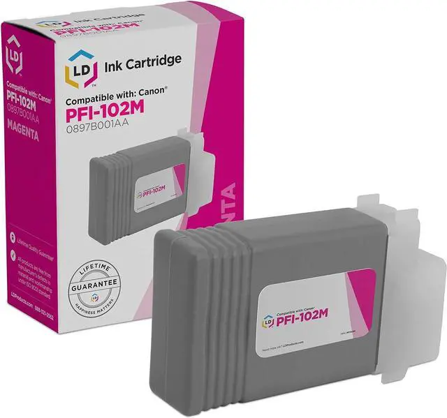 Save even more with our compatible inkjet cartridge. This item includes 1 PFI-102M Magenta ink cartridge. Why pay twice as much for brand name Canon PFI-102 cartridge when our compatible printer supplies deliver excellent quality results for a fraction of the price? Our compatible cartridges for Canon are backed by a full 2 year 100% satisfaction guarantee. So stock up now and save even more! This item works in the following Canon imagePROGRAF Printers: iPF500, iPF510, iPF600, iPF605, iPF610, iPF700, iPF710, iPF710 MFP, and iPF720. Please note, this item will only work with printers purchased within the United States and Canada. We are the exclusive reseller of LD Products brand of high quality printing supplies.