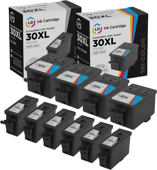 Save even more with our set of 10 Compatible high yield ink cartridges. This set includes 6 1550532 Black, and 4 1341080 Color high yield ink cartridges. Why pay twice as much for brand name OEM Kodak 30XL printer ink cartridge when our compatible printer supplies deliver excellent quality results for a fraction of the price? Our compatible brand replacement ink cartridge for Kodak printers are backed by LIFETIME 100% satisfaction guarantee. So stock up now and save even more! For use in the following Kodak printers: ESP 1.2, ESP 3.2, ESP 3.2S, ESP C110, ESP C310, ESP C315, ESP Office 2150, ESP Office 2170, Hero 2.2, Hero 3.1, Hero 4.2, Hero 5.1. We are the exclusive reseller of LD Products brand of high quality printing supplies.