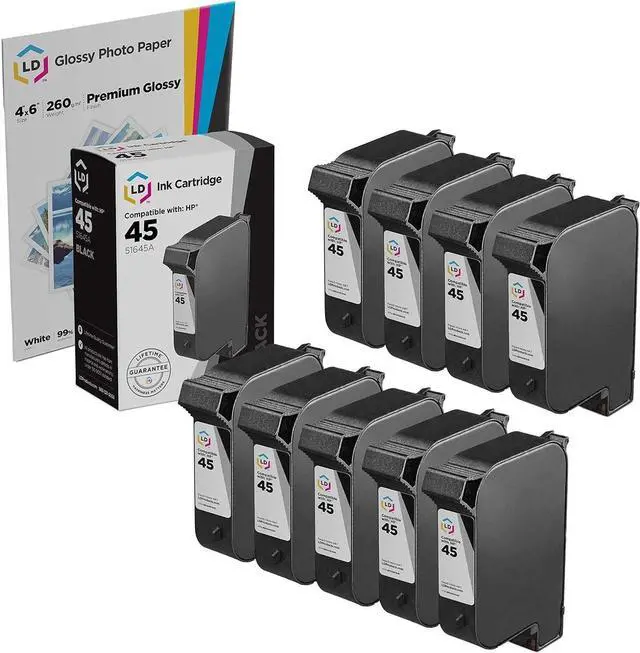 Save even more with our 9 pack of professionally remanufactured HP 45 inkjet cartridges. This set includes 9 HP 51645A (HP 45) black cartridges. Why pay more for brand name HP ink cartridges when our remanufactured printer supplies deliver excellent quality results for a fraction of the price? 100% brand new, manufactured to meet the highest quality and performance standards. Our remanufactured ink cartridges are not remanufactured by HP. This combo set works with the following HP Printers: HP Color Copier 180, 190, 280, 290, HP Deskjet 930, 930C, 932, 932C, 935, 935C, 950, 950C, 952C, 952, 960, 960Cxi, 960Cse, 970C, 970Cxi, 970Cse, 970, 990cxi, 990Cse, 990C, 990cm, 995, 995ck, 995C, 1780cxi, 1780cse, 1780c-ps, 6178, 6127, 9300, HP FAX 1780, 1780xi, HP OfficeJet G55xi, G55, K60, K60xi, K80, K80xi, G85xi, G85, G95, HP PhotoSmart P1000xi, 1000, P1000, P1100, P1100xi, 1100xi, 1100, 1115cvr, 1115, 1455, 1455vm, 1458xi, 1458, 1315, 1315vm . LD Products is the exclusive reseller of LD Products brand of high quality printing supplies.. We are the exclusive reseller of LD Products brand of high quality printing supplies.