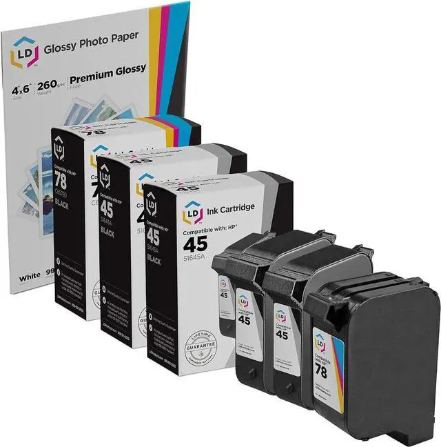 Save and print even more with our professionally remanufactured HP 45 and HP 78 inkjet cartridges. This offer includes 2 remanufactured replacements for HP 45 black / 51645A black ink cartridges and 1 HP 78 color / C6578DN tricolor inkjet cartridges. Our remanufactured ink cartridges have been thoroughly cleaned along with the printhead nozzles. Following the cleaning process, we refilled the cartridge with a professionally manufactured pigment-based ink formula for archival print life and color stability. This ink formula is specially designed to produce vibrant and long-lasting prints comparable to HP. After carefully inspecting the shell for leakage and monitoring the electrical circuitry for efficiency, we put the cartridge through a final print test to be certain it is worth of our lifetime guarantee. Compatible with Color Copier 180, Color Copier 190, Color Copier 280, Color Copier 290, Deskjet 930, Deskjet 930C, Deskjet 932, Deskjet 932C, Deskjet 935, Deskjet 935C, Deskjet 950, Deskjet 950C, Deskjet 952C, Deskjet 952, Deskjet 960, Deskjet 960Cxi, Deskjet 960Cse, Deskjet 970C, Deskjet 970Cxi, Deskjet 970Cse, Deskjet 970, Deskjet 990cxi, Deskjet 990Cse, Deskjet 990C, Deskjet 990cm, Deskjet 995, Deskjet 995ck, Deskjet 995C, Deskjet 1220cxi, Deskjet 1220cse, Deskjet 1220c-ps, Deskjet 6122, Deskjet 6127, Deskjet 9300, FAX 1220, FAX 1220xi, OfficeJet G55xi, OfficeJet G55, OfficeJet K60, OfficeJet K60xi, OfficeJet K80, OfficeJet K80xi, OfficeJet G85xi, OfficeJet G85, OfficeJet G95, PhotoSmart P1000xi, PhotoSmart 1000, PhotoSmart P1000, PhotoSmart P1100, PhotoSmart P1100xi, PhotoSmart 1100xi, PhotoSmart 1100, PhotoSmart 1115cvr, PhotoSmart 1115, PhotoSmart 1215, PhotoSmart 1215vm, PhotoSmart 1218xi, PhotoSmart 1218, PhotoSmart 1315, and PhotoSmart 1315vm inkjet printers. Professionally re-manufactured by LD Products. HP is a registered trademark of HP Inc. and is not affiliated with and does not endorse LD Products.