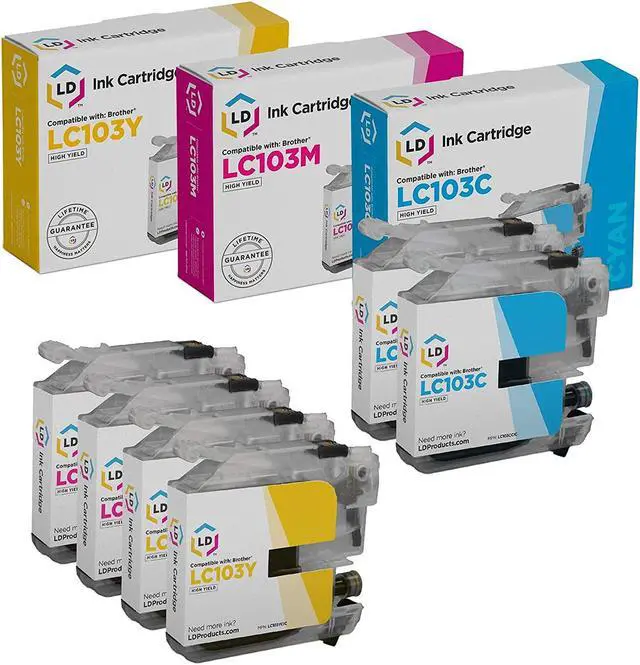 This 6 pack of Brother compatible high yield ink cartridges includes 2 each of cyan (LC103C), magenta (LC103M) and yellow (LC103Y) inkjet cartridges. Save even more with our color ink cartridge set for the Brother LC103 series. Why pay twice as much for brand name Brother LC103 color inkjet cartridges when our LD branded printer supplies match the performance of Brother cartridges. These cartridges are conveniently equipped with a smart chip that allows you to monitor and track your ink levels. So stock up now and save even more! For use in the following printers: Brother MFC-J870DW, MFC-J470DW, MFC-J475DW, MFC-J875DW, MFC-J650DW, MFC-J285DW, MFC-J6920DW, MFC-J450DW, MFC-J245, MFC-J6520DW, MFC-J6720DW Brother DCP-J152W. We are the exclusive reseller of LD Products brand of high quality printing supplies.