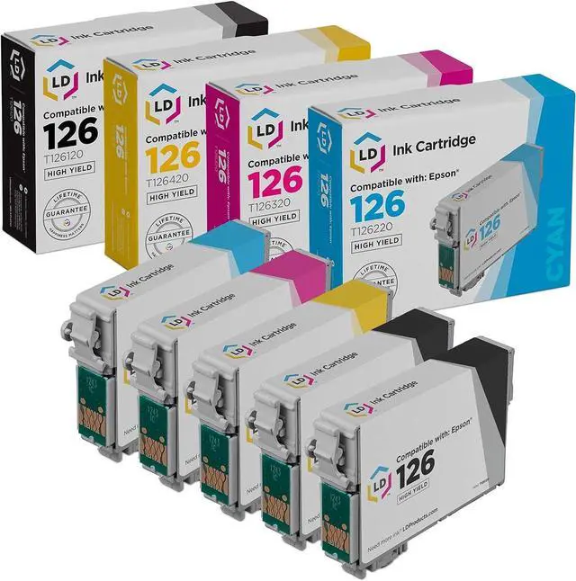 Save and print even more with our high yield replacements for Epson 126 ink cartridges This offer includes (2) 126 Epson ink black (1) 126 cyan ink (1) Epson 126 magenta ink and (1) 126 yellow inkjet cartridges. Why pay twice as much for expensive brand name epson ink cartridges 126 127 when our remanufactured replacements are backed by a 100% satisfaction and lifetime guarantee? Compatible with Stylus NX330, Stylus NX430, WorkForce 435, WorkForce 520, WorkForce 60, WorkForce 630, WorkForce 633, WorkForce 635, WorkForce 645, WorkForce 840, WorkForce 845, WorkForce WF-7010, WorkForce WF-7510, WorkForce WF-7520, WorkForce WF-3520, WorkForce WF-3530, and WorkForce WF-3540 inkjet printers. Please note, retail packaging may vary, and these cartridges will only work with printers purchased within the United States and Canada. The use of replacement epson ink 126 and supplies does not void your printers warranty. Professionally remanufactured by LD Products. Epson is a registered trademark of SEIKO EPSON KABUSHIKI KAISHA Corporation and is not affiliated with and does not endorse LD Products.