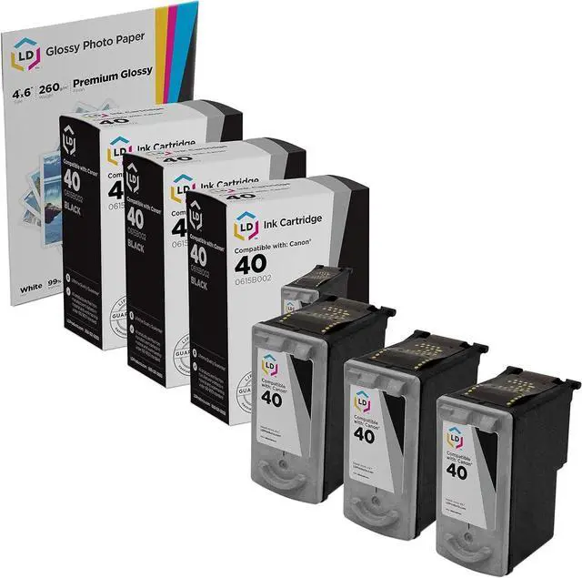 Save even more with our 3 pack of professionally remanufactured Canon PG-40 inkjet cartridges. This set includes 3 PG-40 Black inkjet cartridges. Why pay twice as much for brand name Canon ink cartridges when our remanufactured printer supplies deliver excellent quality results for a fraction of the price? These LD ink cartridges have been thoroughly cleaned along with the print head nozzles, and were filled with the same ink formula. The internal back pressure was insured, the shell was inspected for any possible leakage and the electrical circuitry was tested before finally undergoing an actual print test. Our ink cartridges for your Canon printer are backed by our 100% Satisfaction and Lifetime Guarantee, so stock up no and save even more! For use in the following Canon printers: Canon Pixma iP1600, iP1700, iP1800, iP2600, MP150, MP160, MP170, MP180, MP210, MP450, MP460, MP470, MX300, MX310. We are the exclusive reseller of LD Products brand of high quality printing supplies.com.