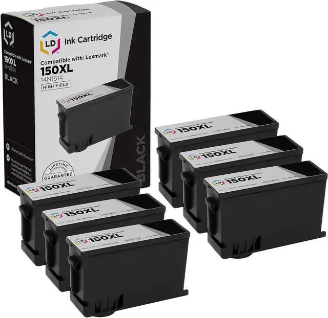 Save and print even more when you shop with LD Products! This Item Includes: (6-Pack, Black) Compatible Ink Cartridge Replacement for Lexmark 150XL 14N1614 High Yield . Why pay twice as much for brand name when our Compatible printer supplies deliver excellent quality results for a fraction of the price? Our Compatible cartridges for Lexmark are backed by a 100% Satisfaction and Lifetime Guarantee. So stock up now and save even more! Enjoy the best prices on our top-rated ink cartridge replacements. Repeat Customers love our printer cartridges! Take advantage of even bigger savings when you shop high yield?ink cartridges that allow you to print more pages. Keep printing longer for a lower price. We offer printer cartridges for hard-to-find printer models. Our cartridges are good for?home, office or when you're running a business.?Our products are put through a rigorous testing process where?they are monitored for quality and reliability. Knowing the?ink cartridge that works?most efficiently with your printer model can save you a ton of money in the long run. Please note, retail packaging may vary and these cartridges will only work with printers purchased within the United States and Canada. The use of compatible cartridges does not void your printer's warranty and our cartridges are not manufactured by Lexmark.