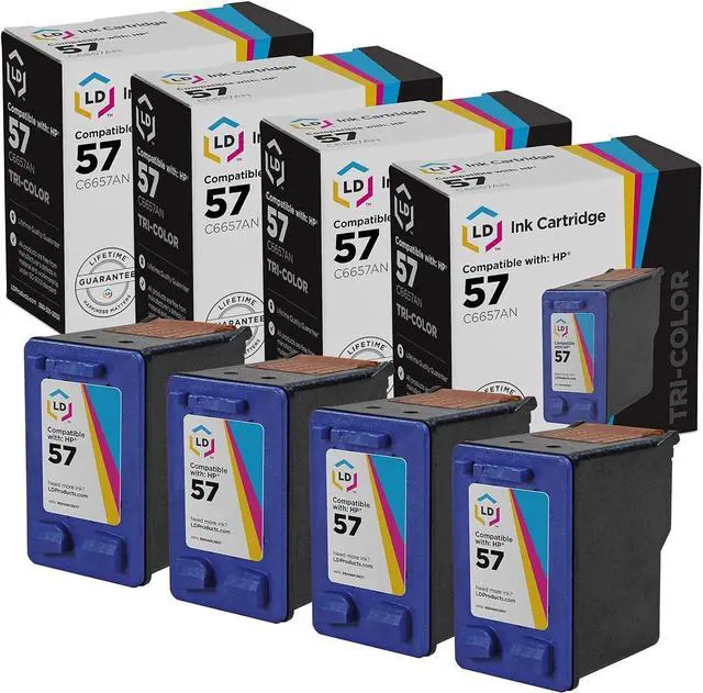 Save even more with our set of 4 HP 57 C6657AN color inkjet cartridges. These LD remanufactured ink cartridges have been thoroughly cleaned along with the printhead nozzles. Following the cleaning process, we refilled the cartridge with a professionally manufactured pigment-based ink formula for archival print life and color stability. This ink formula is specially designed to produce vibrant and long-lasting prints comparable to HP. After carefully inspecting the shell for leakage and monitoring the electrical circuitry for efficiency, we put the cartridge through a final print test to be certain it is worth of our 100% LIFETIME guarantee. Our remanufactured ink cartridges are not remanufactured by HP. For use in the following printers: Deskjet 5550, PSC 1315, OfficeJet 6110, PSC 1210, Deskjet F4140, PhotoSmart 7760, PhotoSmart 7350, Deskjet 5650, OfficeJet 5510, OfficeJet 4215, Deskjet F4135, PhotoSmart 7960, Deskjet 5150, PSC 1350, PSC 1209, PhotoSmart PSC 2410v, PhotoSmart 7660, PhotoSmart 7550, OfficeJet 4110, PSC 2410, PSC 2175, Deskjet F4185, Deskjet F4180, OfficeJet 5510v, OfficeJet 4215xi, OfficeJet 4215v, Deskjet 9650, PhotoSmart 7450, PhotoSmart 7260, PhotoSmart 7150, OfficeJet 6110xi, Deskjet 5850, PSC 2410xi, PSC 2210, PSC 2110, PSC 1315v, PSC 1315xi, PSC 1210v, PSC 1210xi, PSC 1110, Deskjet 450, PSC 1312, Deskjet F4172, Deskjet F4150, PSC 2210xi, PSC 2210v, PSC 2410v, PSC 1311, OfficeJet 5505, OfficeJet 5510xi, PhotoSmart 7755, Deskjet 9680, Deskjet 9670, PhotoSmart 7960w, PhotoSmart 7760w, PhotoSmart 7760v, PhotoSmart 7660w, PhotoSmart 7660v, PhotoSmart 7450v, PhotoSmart 7260w, PhotoSmart 7260v, Deskjet 5850w, Deskjet 5650w, Deskjet 5150w. LD Products is the exclusive reseller of LD Products brand of high quality printing supplies. We are the exclusive reseller of LD Products brand of high quality printing supplies.