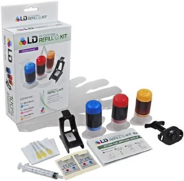 Save and print even more when you shop with LD Products! This HP 60 / 60XL Tri-Color Ink Refill Kit contains: (1) 20ml bottle of cyan ink (1) 20ml bottle of magenta ink, (1) 20ml bottle of yellow ink (each bottle yields 2 refills), (1) manual, (1) screw tool, (3) injection needles and (1) pair of plastic gloves. LD inkjet cartridge refill kits allow you to refill your existing empty ink cartridge. Why buy an expensive brand-new ink cartridge when you can refill the cartridge you already have for much less? The HP 60 / 60XL tri-color ink cartridge is compatible with the following printers: DeskJet D1620, D1630, D1658, D1660, D1663, D1668, D2530, D2545, D2560, D2563, D2566, D2568, D2645, D2660, D2663, D2666, D2668, D2680, D5545, D5560, D5563, D5568, F2400, F2420, F2423, F2430, F2480, F2483, F2488, F2492, F2493, F4210, F4213, F4230, F4235, F4240, F4250, F4272, F4273, F4274, F4275, F4280, F4283, F4288, F4292, F4293, F4400, F4450, F4480, F4500, F4580, ENVY 100, 110, 111, 114,120, 121 & PhotoSmart C4600, C4610, C4635, C4640, C4650, C4680, C4683, C4685, C4690, C4700, C4740, C4750, C4780, C4783, C4795, C4799, D110a