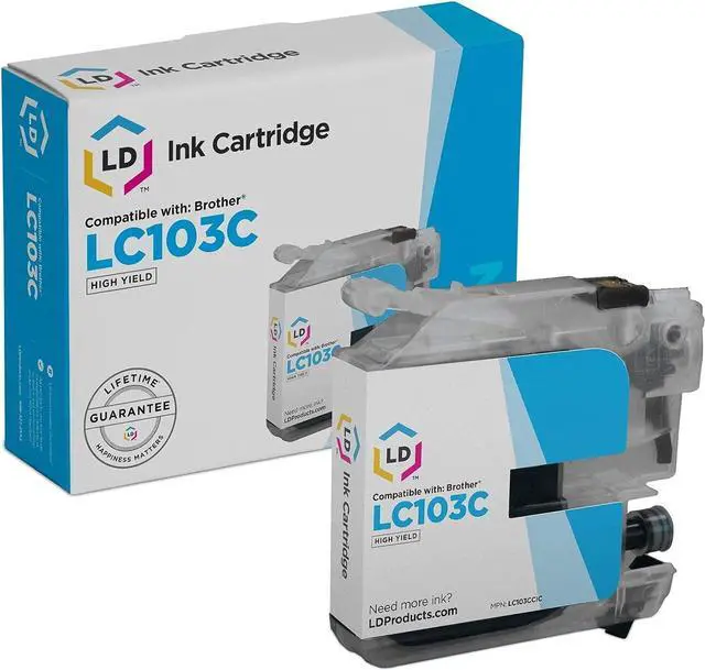 Our compatible LC103C high yield cyan inkjet cartridges for your Brother printer is manufactured to meet the same specifications and performance standards as the Brother LC103C ink-jet cartridges. We guarantee that you will get the same quality printouts as your genuine Brother LC103C ink jet cartridges or your money back. Why pay more for a LC103C brand name ink cartridge? Save money compared to MSRP on all the LC-103 series inkjet cartridges for your Brother printer. These cartridges are conveniently equipped with a smart chip that allows you to monitor and track your ink levels. Compatible with the following printers: Brother DCP-J152W, MFC-J245, MFC-J285DW, MFC-J450DW, MFC-J470DW, MFC-J475DW, MFC-J650DW, MFC-J6520DW, MFC-J6720DW, MFC-J6920DW, MFC-J870DW, MFC-J875DW. We are the exclusive reseller of LD Products brand of high quality printing supplies.