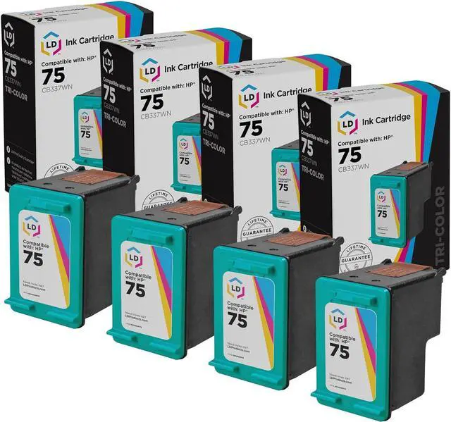 Save even more with our set of 4 HP 75 CB337WN color inkjet cartridges. These LD remanufactured ink cartridges have been thoroughly cleaned along with the printhead nozzles. Following the cleaning process, we refilled the cartridge with a professionally manufactured pigment-based ink formula for archival print life and color stability. This ink formula is specially designed to produce vibrant and long-lasting prints comparable to HP. After carefully inspecting the shell for leakage and monitoring the electrical circuitry for efficiency, we put the cartridge through a final print test to be certain it is worth up of our 100% money-back guarantee. Our remanufactured ink cartridges are not remanufactured by HP. So Stock now and save even more! For use in the following printers: OfficeJet J5783, PhotoSmart C4343, Deskjet D4360, PhotoSmart C5280, OfficeJet J5790, OfficeJet J5725, PhotoSmart C5288, PhotoSmart C5275, PhotoSmart C4383, PhotoSmart C4342, OfficeJet J6424, PhotoSmart C5580, PhotoSmart C4440, PhotoSmart C4280, OfficeJet J5780, OfficeJet J5738, PhotoSmart C4588, PhotoSmart C4575, PhotoSmart C4348, PhotoSmart C4344, OfficeJet J5735, PhotoSmart C4450, Deskjet D4260, PhotoSmart C4250, Deskjet D4280, PhotoSmart C4210, OfficeJet J5750, PhotoSmart C4400, PhotoSmart C5550, PhotoSmart C4599, PhotoSmart C4483, OfficeJet J5730, PhotoSmart C5240, PhotoSmart C4380, PhotoSmart C5250, PhotoSmart C52801, PhotoSmart C4435, PhotoSmart C5540, PhotoSmart C4485, PhotoSmart C4472, Deskjet D4363, PhotoSmart C4480, PhotoSmart C4288, PhotoSmart C4270, OfficeJet J6480, OfficeJet J6413, OfficeJet J6410, OfficeJet J5740, PhotoSmart C4240, PhotoSmart D5360, PhotoSmart C5283, PhotoSmart C4550. LD Products is the exclusive reseller of LD Products brand of high quality printing supplies. We are the exclusive reseller of LD Products brand of high quality printing supplies.