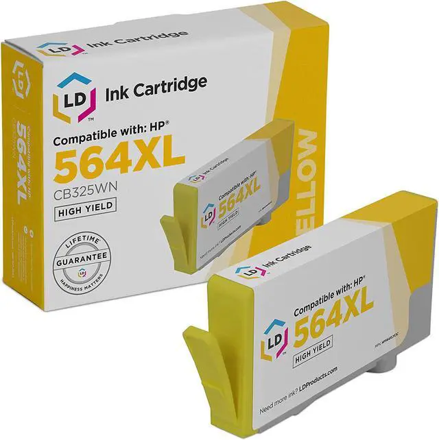 This LD compatible CB325WN (HP 564XL) high-yield yellow inkjet cartridge is an original Hewlett Packard CB325WN ink cartridge which has been through one cycle of service and has been recharged. This professionally compatible LD cartridge for HP 564XL has a smart chip that makes continuous adjustments to optimize print quality and enhance reliability and cost effectiveness as well as monitor ink levels. The ink delivery system allows for efficient, economical replacement of individual ink cartridges. Why buy an original HP CB325WN cartridge when you can get perfect quality out of our LD compatible CB325WN inkjet cartridge at a fraction of the cost? Our compatible ink cartridges are not manufactured by HP. We offer a Two-Year 100% Quality Satisfaction Guarantee on our compatible CB325WN ink cartridges. For use in the following HP Photosmart, Photosmart Premium Fax e-All-in-One, eStation, TouchSmart, DeskJet, and Officejet printers: C309a, B209a, C6380, C309g, B8550, D7560, C5300 Series, C6300, D5460, D5463, C5324, D5400, C5390, C6350, C6388, C6383, C5388, C5383, C6375, C6340, C5380, C6324, B8553, B8558, C5373, B8500, C5370, D5445, D5468, C5393, 5510 , 7520 , 7510 , 5520 , 6520 , 7525 , 6510 , 5514, C310, 7515 , 6515 , 5512 , 5515 , C309 Series, 5525, D7500, 6525 , B210a, C510, 5524, 5511 , 5522 , C510a, 6512 , B210b, B210c, B210e, 3521 , 3522, 3520 , 3070a , 3526, 4620, 4622, C410b, C410e. We are the exclusive reseller of LD Products brand of high quality printing supplies.