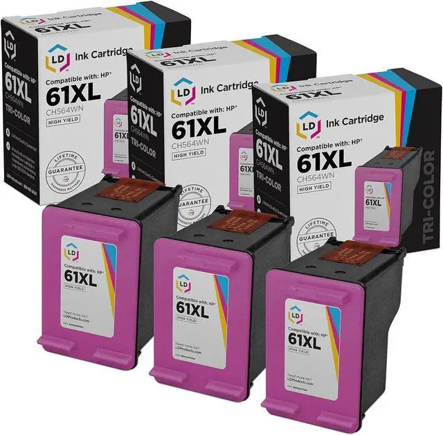 Save even more with our 3 pack of professionally remanufactured HP 61XL (CC564WN) High Yield Color Inkjet cartridges. This set includes 2 HP CC564WN (HP 61XL) high yield color inkjet cartridges. These LD remanufactured ink cartridges have been thoroughly cleaned along with the printhead nozzles. Following the cleaning process, we refilled the cartridge with a professionally manufactured pigment-based ink formula for archival print life and color stability. This ink formula is specially designed to produce vibrant and long-lasting prints comparable to HP. After carefully inspecting the shell for leakage and monitoring the electrical circuitry for efficiency, we put the cartridge through a final print test to be certain it is worth of our 100% LIFETIME guarantee. Our remanufactured ink cartridges are not remanufactured by HP. So stock up now and save even more! This combo set works with the following HP Printers: Deskjet 1000, 1010, 1015, 1050, 1051, 1055, 1056, 1510, 1512, 2050, 2510, 2512, 2514, 2540, 2541, 2542, 2543, 2544, 2545, 2547, 3000, 3050, 3050A, 3051A, 3052A, 3054, 3056A, 3510, 3511, 3512, 3516, & ENVY 4500 e-All-in-One, 4501, 4502, 4504 e-All-in-One, 4505 e-All-in-One, 5530 e-All-in-One, 5531 e-All-in-One, 5535 e-All-in-One, OfficeJet 2620, 4630, 4632, 4635, 8040.