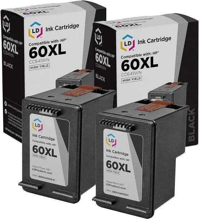 Save and print even more when you shop with LD Products! For Use In HP Photosmart, ENVY e All-in-one, and Deskjet printers. Compatible Replacements Included: 2 Pack ?CC641WN Black | HP 60XL Ink Cartridge | High YieldDeliver 600 pages just like the original HP 60XL ink cartridge | Average cartridge page yield in accordance with ISO IEC 24711This is the high yield version of HP ink cartridge HP 60XLHP is a registered trademark of HP and is not affiliated with and does not endorse LD Products. Professionally manufactured by LD Products. Please note, retail packaging may vary and this toner cartridge will only work with printers purchased within the United States and Canada. The use of compatible replacement printing supplies does not void your printer warranty.