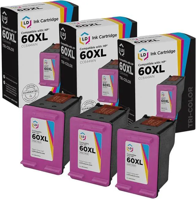 Save and print even more when you shop with LD Products! For Use In HP Photosmart, ENVY e All-in-one, and Deskjet printers. Compatible Replacements Included: 3 Pack CC644WN Tri Color| HP 60XL Ink Cartridge | High YieldDeliver 440 pages just like the original HP 60XL ink cartridge | Average cartridge page yield in accordance with ISO IEC 24711This is the high yield version of HP ink cartridge HP 60XLHP is a registered trademark of HP and is not affiliated with and does not endorse LD Products. Professionally manufactured by LD Products. Please note, retail packaging may vary and this toner cartridge will only work with printers purchased within the United States and Canada. The use of compatible replacement printing supplies does not void your printer warranty.