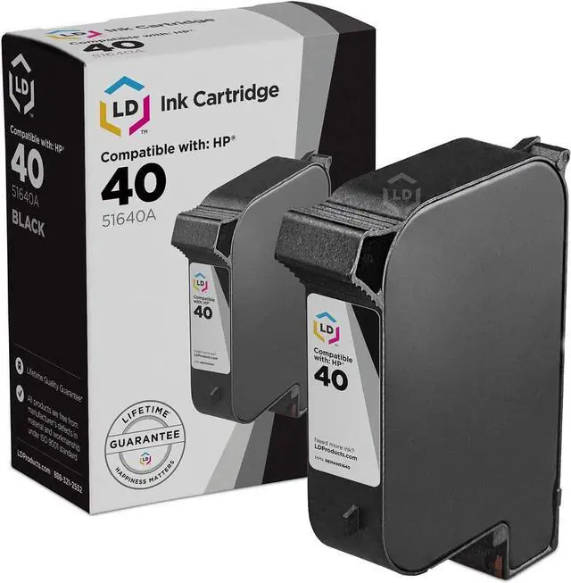 Save and print even more when you shop with LD Products! This Item Includes: (1-Pack, Black) Remanufactured Ink Cartridge Replacement for HP 40 51640A . Why pay twice as much for brand name when our Compatible printer supplies deliver excellent quality results for a fraction of the price? Our Compatible cartridges for HP are backed by a 100% Satisfaction and Lifetime Guarantee. So stock up now and save even more! Enjoy the best prices on our top-rated ink cartridge replacements. Repeat Customers love our printer cartridges! Take advantage of even bigger savings when you shop high yield?ink cartridges that allow you to print more pages. Keep printing longer for a lower price. We offer printer cartridges for hard-to-find printer models. Our cartridges are good for?home, office or when you're running a business.?Our products are put through a rigorous testing process where?they are monitored for quality and reliability. Knowing the?ink cartridge that works?most efficiently with your printer model can save you a ton of money in the long run. Please note, retail packaging may vary and these cartridges will only work with printers purchased within the United States and Canada. The use of compatible cartridges does not void your printer's warranty and our cartridges are not manufactured by HP.
