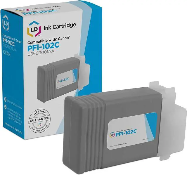 Our compatible PFI-102C (0896B001AA) pigment cyan inkjet cartridges for your Canon printers are manufactured to meet the same original specifications and performance standards as the Canon PFI-102C OEM cartridges. Our compatible PFI-102C ink cartridges contain a brand new chip which allows you to track your printer ink levels. Benefit from tracking ink levels with our compatible PFI-102 cyan cartridge with a smart chip. We offer a Two Year 100% Quality Satisfaction Guarantee on our compatible PFI-102C inkjet cartridges. For use in the following Canon imagePROGRAF printers: iPF500, iPF510, iPF600, iPF605, iPF610, iPF650, iPF655, iPF700, iPF710, iPF710 MFP, iPF720, iPF750, iPF750 MFP, iPF750 MFP M40, iPF755, iPF755 MFP, iPF760, iPF760 MFP, iPF760 MFP M40, iPF765, iPF765 MFP, iPF765 MFP M40. We are the exclusive reseller of LD Products brand of high quality printing supplies.