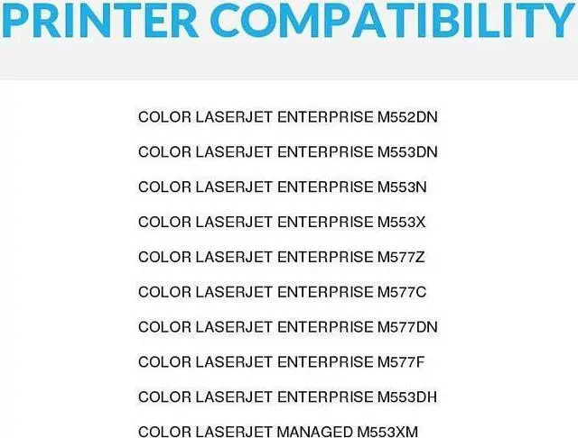 • Compatible with: HP Color LaserJet | Color LaserJet Enterprise; Enterprise; LaserJet; LaserJet Enterprise: M533X, M552dn, M553dh, M553dn, M553n, M577c, M577dn, M577f, M577z; LaserJet Managed M553xm