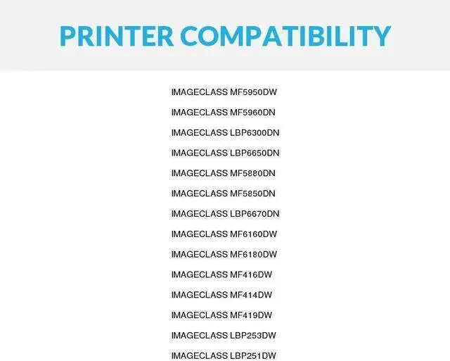 For use in Canon: ImageClass LBP6300dn, ImageClass LBP6650dn, ImageClass LBP6670dn, ImageClass M6160dw, ImageClass MF5850dn, ImageClass MF5880dn, ImageClass MF5950dw, ImageClass MF5960dn, & ImageClass MF6180dw