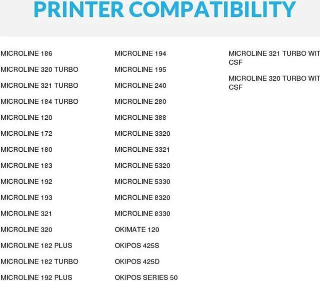 Compatible with: Microline 120, 172, 180, 182 Plus, 182 Turbo, 183, 184 Turbo, 186, 192 Plus, 193, 194, 195, 240, 280, 320 Turbo with CSF, 321 Turbo with CSF, 388, 3320, 3321, 5320, 5330, 8320, 8330, Oki 120, Series 50, 425D, 425S