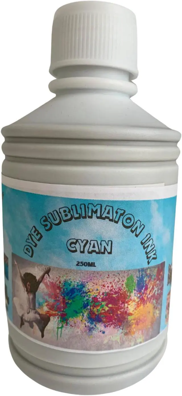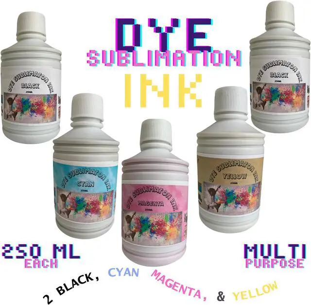 Package Contains 5 Bottles Each 250ml of Sublimation Ink. A complete Set plus Black. 2 Black, 1 Cyan, 1 Magenta, & 1 Yellow.