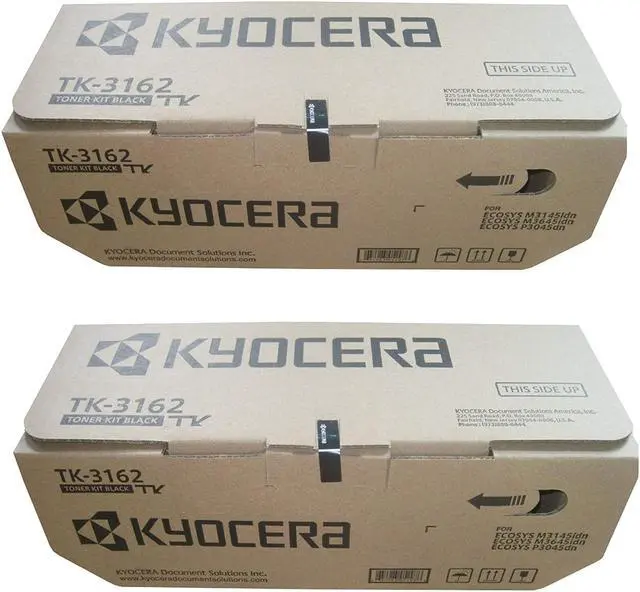 Genuine Kyocera TK-3162 black toner cartridge for ECOSYS P3045DN. Contains 2 genuine Kyocera 1T02T90USO black toner cartridges.
