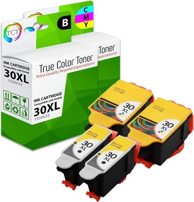 TRUE COLOR TONER: Print Quality Beyond Your Expectations!With True Color Toner compatible ink cartridges, say goodbye to outrageously priced toner cartridges! Our premium cartridges are the perfect replacements to their OEM versions.* Contents: 2 30XL Black and 2 30XL replacement Ink Cartridges* Replaces OEM#(s): 1550532 (Black), 1341080 (Color)* Page Yield(s): 670 pages per Black and 550 per color cartridge average page yield at 5% coverage.* Package Quantity: Four Pack ( 2BK,2CL )* Compatible with: Kodak ESP C110, ESP C310, ESP C315, ESP Office 2150, ESP Office 2170, ESP 3.2, Hero 3.1, Hero 4.2, and Hero 5.1* Warranty: TCT cartridges are Manufactured in ISO 9000 and 10041 certified facilities. We guarantee the quality and reliability of our compatible cartridges, and back them with a 1 Year warranty against manufacturer defects.