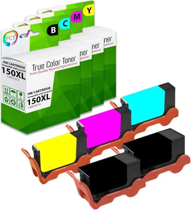 TRUE COLOR TONER: Print Quality Beyond Your Expectations!With True Color Toner compatible ink cartridges, say goodbye to outrageously priced toner cartridges! Our premium cartridges are the perfect replacements to their OEM versions.* Contents: 2 150XL Black, 1 150XL Cyan, 1 150XL Magenta, and 1 150XL Yellow replacement Ink Cartridges* Replaces OEM#(s): 14N1614 (150XL BK), 14N1615 (150XL C), 14N1616 (150XL M), 14N1618 (150XL Y)* Page Yield(s): 750 pages per Black and 700 per color cartridge average page yield at 5% coverage.* Package Quantity: Five Pack ( 2BK,1C,1M,1Y )* Compatible with: Lexmark Pro715, Pro915, S315, S415, S515* Warranty: TCT cartridges are Manufactured in ISO 9000 and 10041 certified facilities. We guarantee the quality and reliability of our compatible cartridges, and back them with a 1 Year warranty against manufacturer defects.