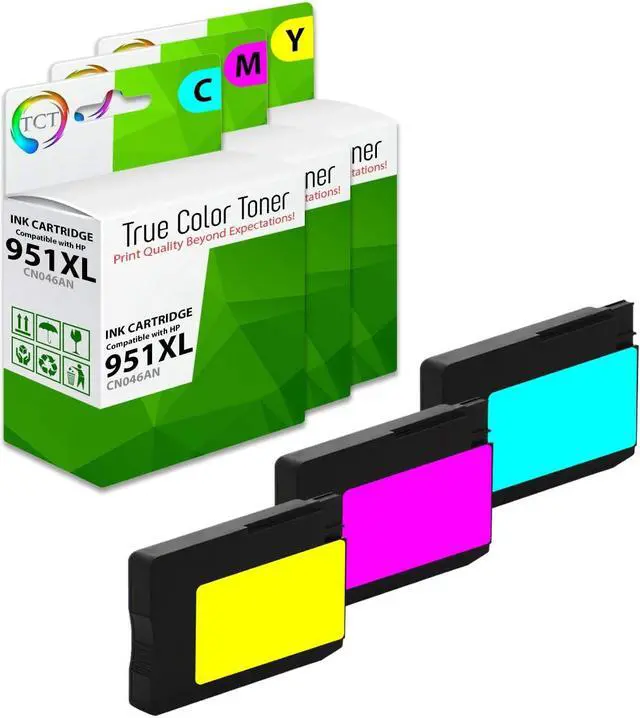 3 Pack TCT Compatible HP 951XL Replacement Ink CartridgeReplaces OEM: CN046AN (951XL C), CN047AN (951XL M), CN048AN (951XL Y)Box Contains: 1 Cyan, 1 Magenta, 1 Yellow ink cartridgesPrinter Compatibility: HP OfficeJet Pro 251dw 276dw MFP, 8100 8600 8600 Plus 8600 Premium 8610 8620 8630TCT: Print Quality Beyond Your Expectations!With TCT ink cartridges, you can enjoy the full benefits of high quality printing and exponential savings.Dependable Printer Supplies.Specially formulated ink provides the highest print quality from HP 951XL ink cartridges. Our 276DW MFP ink cartridges are designed and engineered to work for specific set of printers to achieve high accuracy and consistent prints.Excellent Premium Printing Experience.TCT provides premium HP 8620 ink cartridge replacements that are reasonably priced for reliability, quality and performance. Every printer cartridge is manufactured using the latest technologies adhering thestrict STMC and ISO factory standards making our products ISO9001 and ISO14001 certified.Reliable Customer Service.We have a team of committed and friendly technical assistants ready to offer every customer expert advice. Experience hassle-free online shopping.Extensive Range of Ink Cartridges.We offer a wide variety of HP 8600 ink cartridges in different value packs that sticks to your budget. Choose the right package and save on your supplies. Guaranteed 100% brand newand work seamlessly with your Pro 251DW printer.