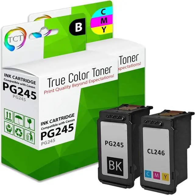 TRUE COLOR TONER: Print Quality Beyond Your Expectations!With True Color Toner compatible ink cartridges, say goodbye to outrageously priced toner cartridges! Our premium cartridges are the perfect replacements to their OEM versions.* Contents: 1 PG245 Black and 1 CL246 replacement Ink Cartridges* Replaces OEM#(s): PG245 , CL246* Page Yield(s): 300 pages per Black and 300 per color cartridge average page yield at 5% coverage.* Package Quantity: TwoPack ( 1BK,1CL )* Compatible with: Canon PIXMA iP2820, MG2420, MG2520, MG2555, MG2920, MG2922, MG2924, MG3020, MX490, MX492* Warranty: TCT cartridges are Manufactured in ISO 9000 and 10041 certified facilities. We guarantee the quality and reliability of our compatible cartridges, and back them with a 1 Year warranty against manufacturer defects.