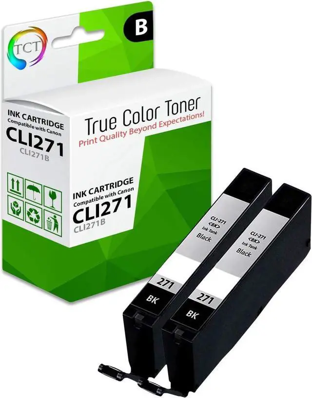 TRUE COLOR TONER: Print Quality Beyond Your Expectations!With True Color Toner compatible ink cartridges, say goodbye to outrageously priced toner cartridges! Our premium cartridges are the perfect replacements to their OEM versions.* Contents: 2 CL271B Black replacement Ink Cartridges* Replaces OEM#(s): CLI271B* Page Yield(s): 665 pages average page yield at 5% coverage.* Package Quantity: Two Pack ( 2BK )* Compatible with: Canon PixmaMG5720, MG5721, MG5722, MG6820, MG6821, MG6822, MG5720, MG7720, TS5020, TS6020, TS6020, TS8020, TS9020* Warranty: TCT cartridges are Manufactured in ISO 9000 and 10041 certified facilities. We guarantee the quality and reliability of our compatible cartridges, and back them with a 1 Year warranty against manufacturer defects.